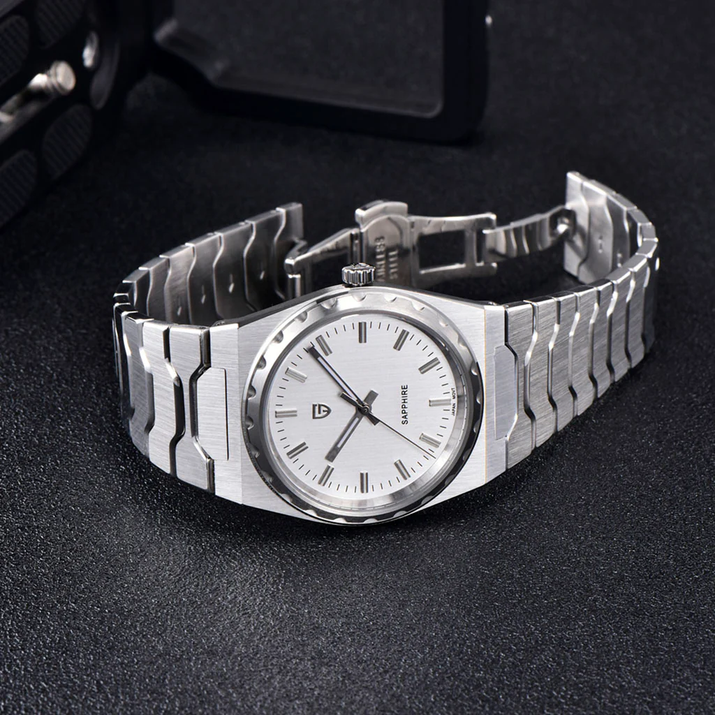 A pulseira do Pagani Design Drift Silver White é cuidadosamente projetada com materiais premium, combinando a elegância e a resistência do aço 316L. Proporciona um conforto incomparável e uma sensação única de estar usando um relógio quase imperceptível no pulso.
