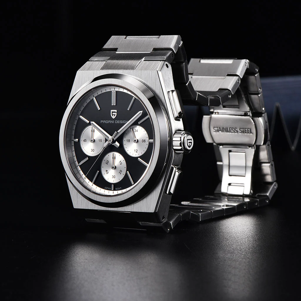 O movimento Seiko VK63 é conhecido por seu desempenho excepcional em termos de precisão e confiabilidade. O Pagani Design Tide Black equipado com o movimento VK63, possui uma operação suave e precisa do cronógrafo.